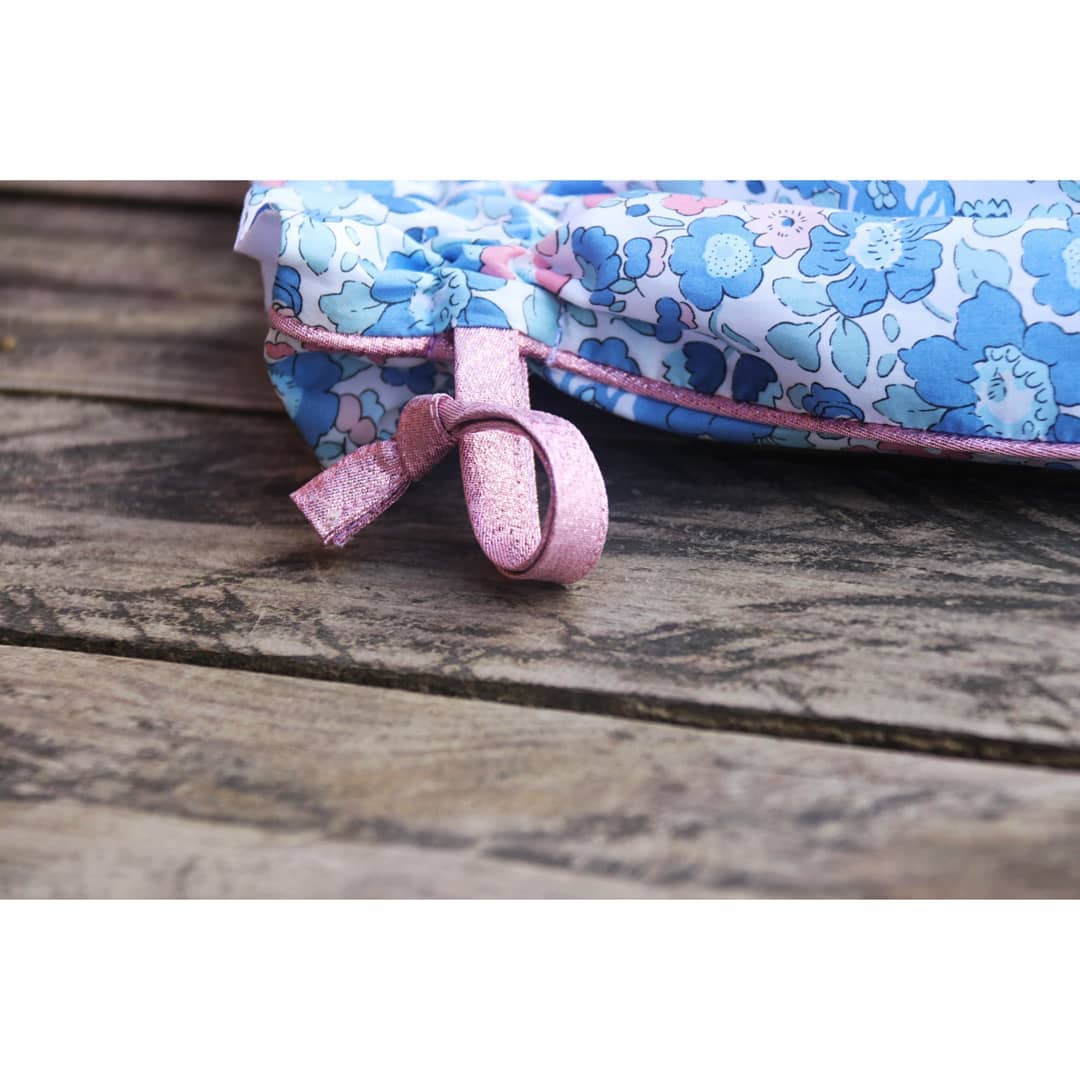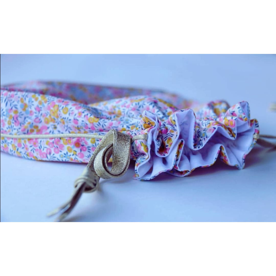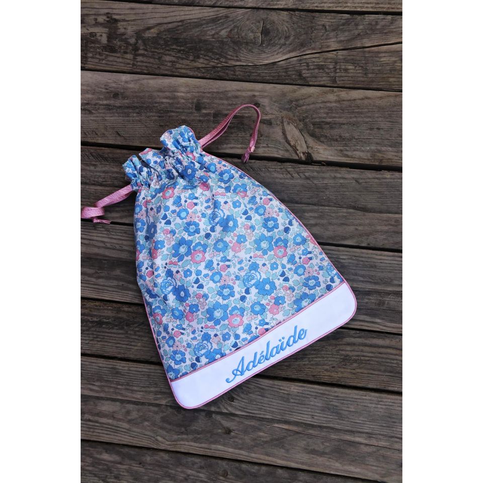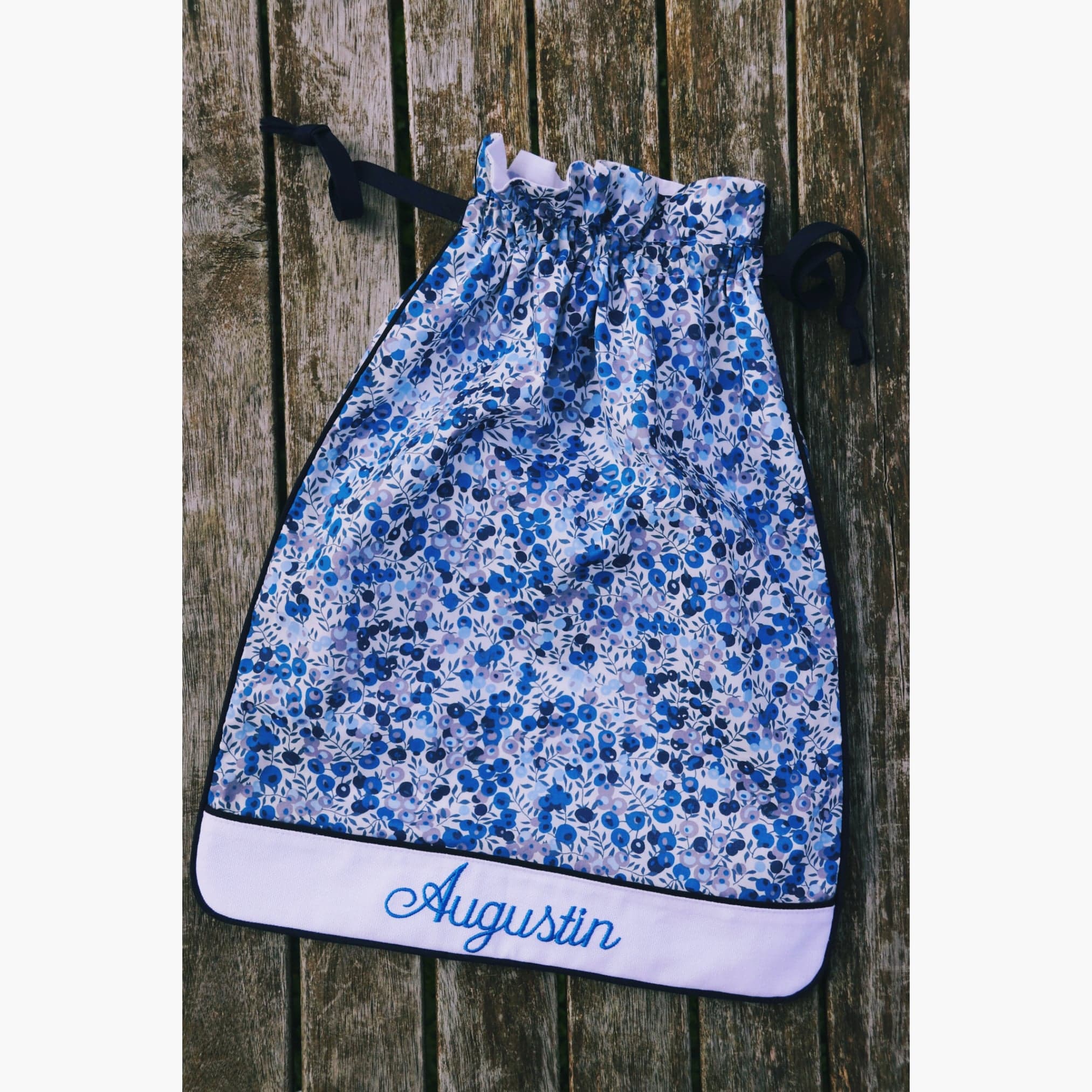 *étiquette ( le pochon est quasi en totalité en liberty, et en sa partie inférieure, une étiquette unie est brodée),